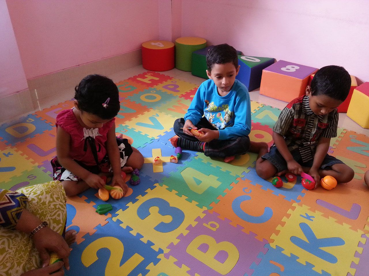 Playgroup students are learning name of the fruits and vegetables through use of toys.Functional play helps children to develop motor and practice skills. This kind of play is normally done with toys or objects that are stack-able. Through toys play or interactive play is a favorite amongst pre-school children and a valuable teaching tool.
